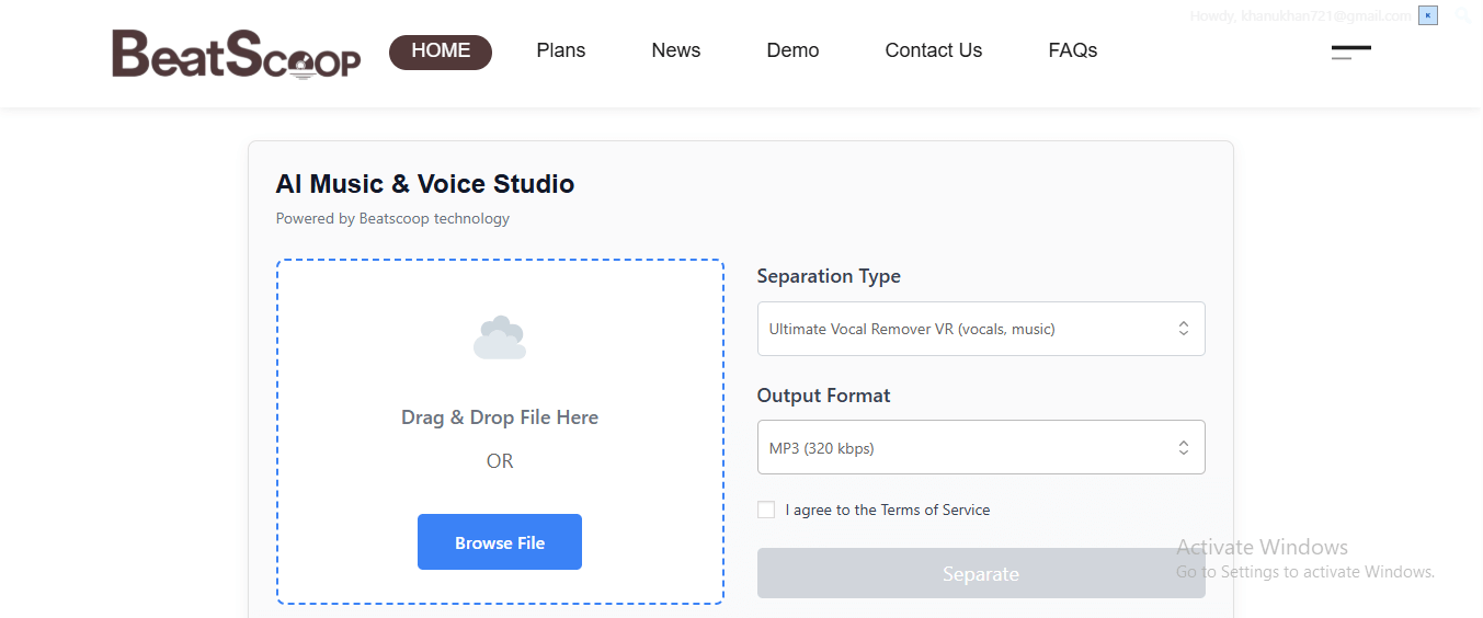 Open the audio separation tool on the BeatScoop website. The application automatically separates and cleans audio components using AI technology.